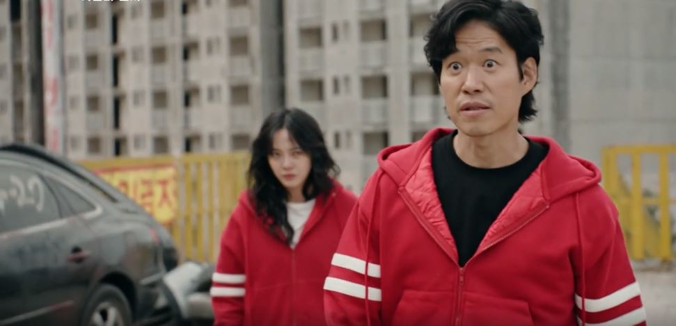 악귀 일행은 백두건설의 박프로를 만나서 사라진 돈의 행방을 물어봅니다. 박프로가 모른다고 하자 필광은 염력으로 박프로 혼자 자기 목을 스스로 조르게 합니다.  그런데 하필 그 순간 마주석(진선규)의 아내 민지가 그 엘리베이터 앞에서 그 모습을 보게 됩니다.