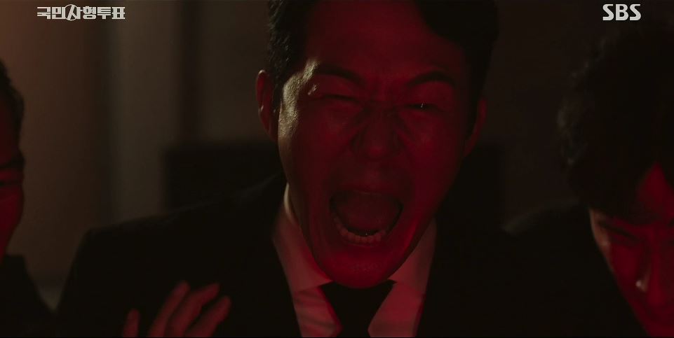 이에 석주는 민수에게 살고 싶으면 진심으로 뉘우치라고 하면서 진심으로 뉘우치면 국민들도 다른 선택을 할 거라고 합니다. 그런데 민수는 쇼하지 말라고 합니다. 석주가 왜 나래를 죽였나고 민수에게 묻는데, 민수는 나래 때문에 자신을 봐주지 않아서 짜증 나서 죽였다고 합니다. 이에 고작 그런 이유로 나래를 죽였냐며 격노하며 민수를 해하려 하는데, 국민사형투표를 해야 하기에 정진욱이 석주를 말립니다.