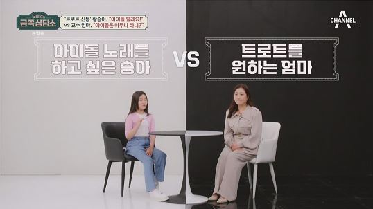 황승아는 본격적인 상담에서 "트로트를 그만두고 아이돌 가수가 되고 싶다"는 반전 고민을 공개했습니다. 그녀는 BTS처럼 외국에서도 유명한 사람이 되고 싶다는 당찬 속마음을 밝혔습니다. 하지만 이진영 엄마는 "승아가 트로트를 계속하는 것이 빠르게 성공할 수 있는 길이다"라는 반대 의견을 제시하며 모녀간 진로 갈등을 보여주었습니다. 이에 황승아는 트로트에 흥미를 잃었다고 솔직하게 고백하며, 이로 인해 유튜브에 올릴 노래를 선택할 때도 엄마와의 '아이돌 노래 vs 트로트'로 인한 갈등이 있음을 털어놓았습니다.
