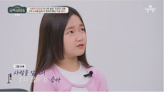 이 이야기를 들은 오은영 박사는 악플은 9살아이가 감당할 수 없는 일이라며 상처받은 황승아를 위로해 주며 통제할 수 없는 상황에서 생긴 불안감은 사회적 민감성이 높아진 것이라고 분석합니다. 사회적 민감성이 과도하게 높아질 경우에는 갈등을 피하기 위해서 자신의 감정을 숨길 수 도 있다고 조언하면서 황승아의 마음을 어루만집니다.