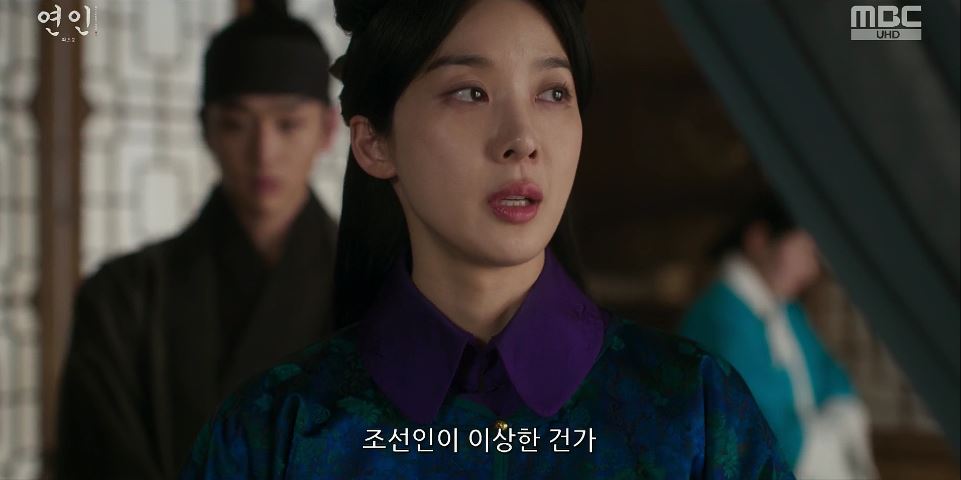그런 후 각화는 통역하는 시녀를 불러서 자신은 조선말을 못 하는 척하면서 길채에게 포로로 잡혀서 왜 죽지 않았냐고 물어보는데, 길채는 자신을 살리려는 사람이 있는데 왜 죽냐며 그 사람을 생각해서라도 악착같이 살 것이라고 합니다. 그러면서 각화에게 만약 자신을 죽이면 그 사람이 너도 가만 두지 않을 거라고 합니다.