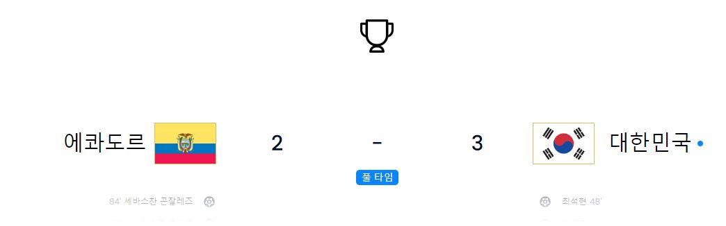 마지막으로 에콰도르가 전반적으로 공세를 가하는 가운데, 한국은 밀집 수비와 역습을 통해 에콰도르의 공격을 막아냈습니다. 한국의 수비진은 특히나 김준홍을 비롯한 선수들의 노력으로 에콰도르의 득점을 최소화했습니다. 경기 종료 직전에는 이영준이 헤더로 골망에 향했지만 골키퍼에게 막혀 크로스바를 넘기지 못했습니다.