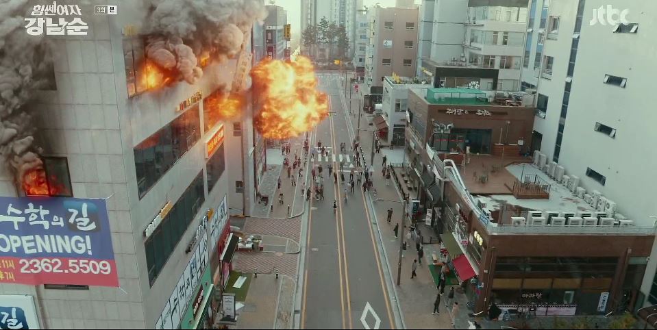 그때 폭발이 다시 일어나고 남순이 빌딩밖으로 떨어지게 되자, 금순은 점프 능력이 없는 것 같은데도, 딸 남순을 위해서 자신의 몸을 던져 남순을 안으며, 힘쎈여자 강남순 3회는 막을 내립니다.