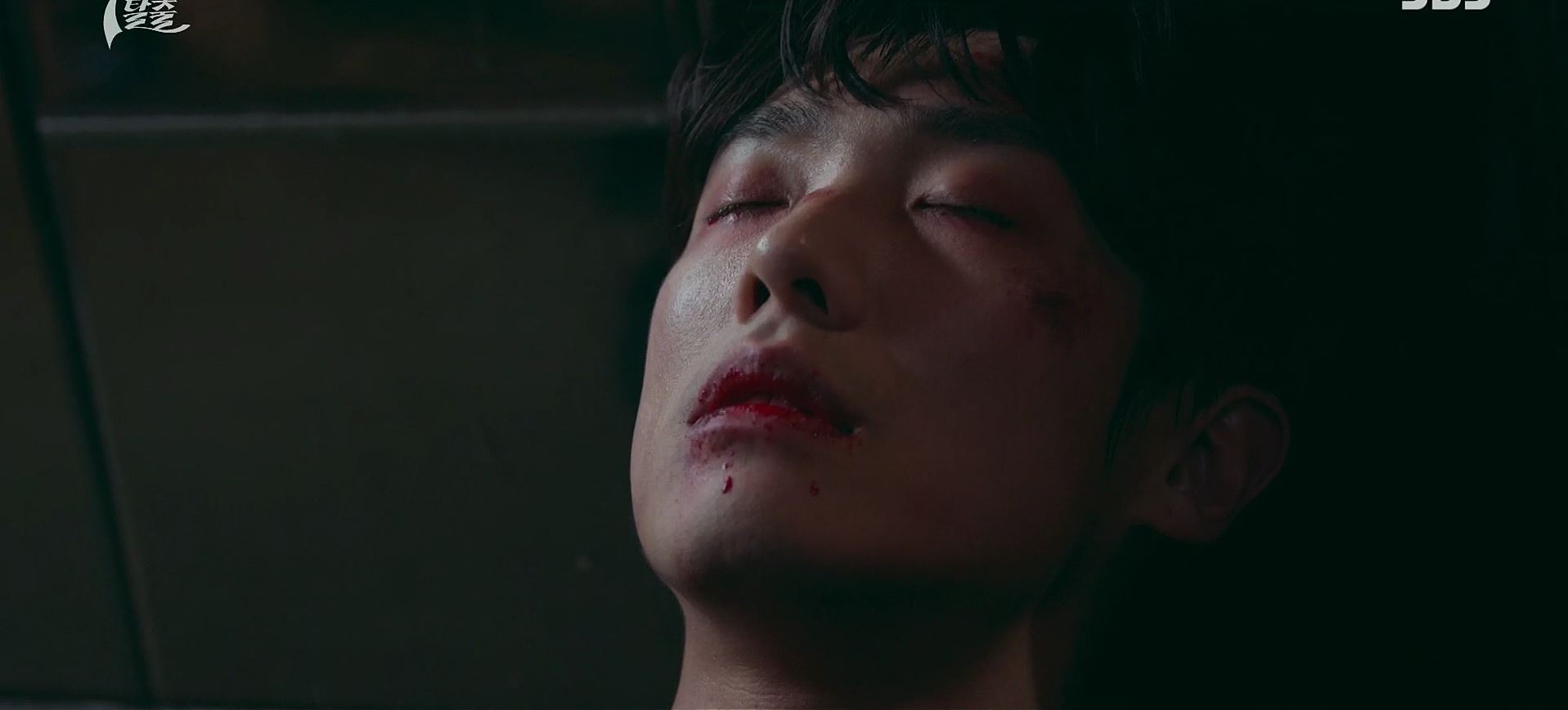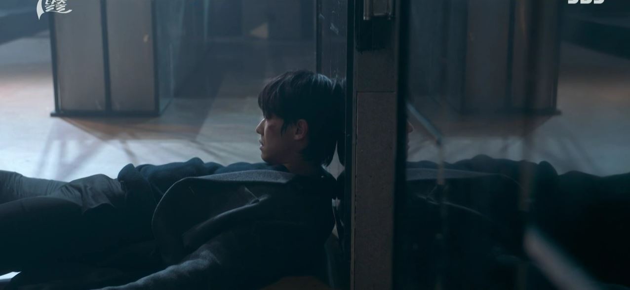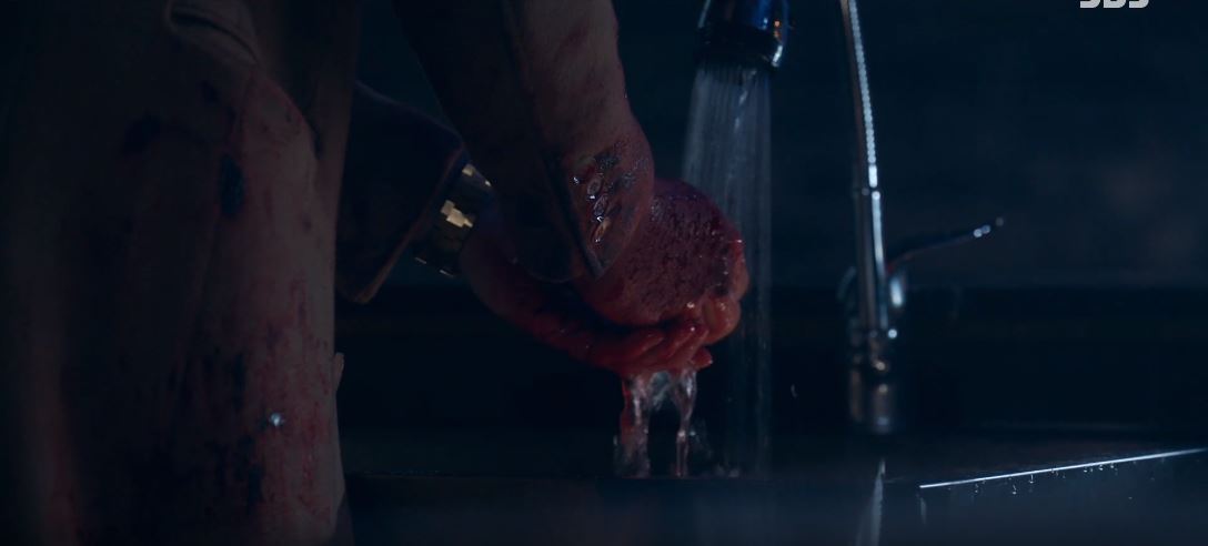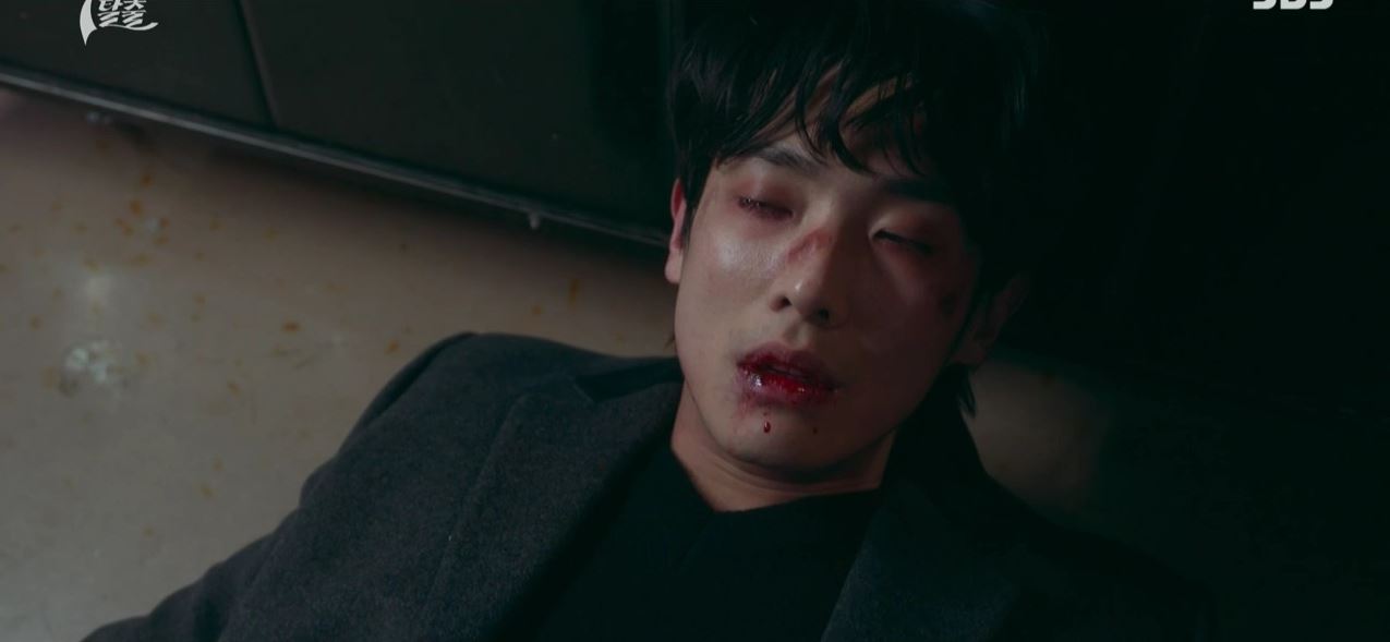 도혁은 K에게 칼을 맞고 쓰러져 있고, 누군가가 손에 피를 닦아내고 있습니다.