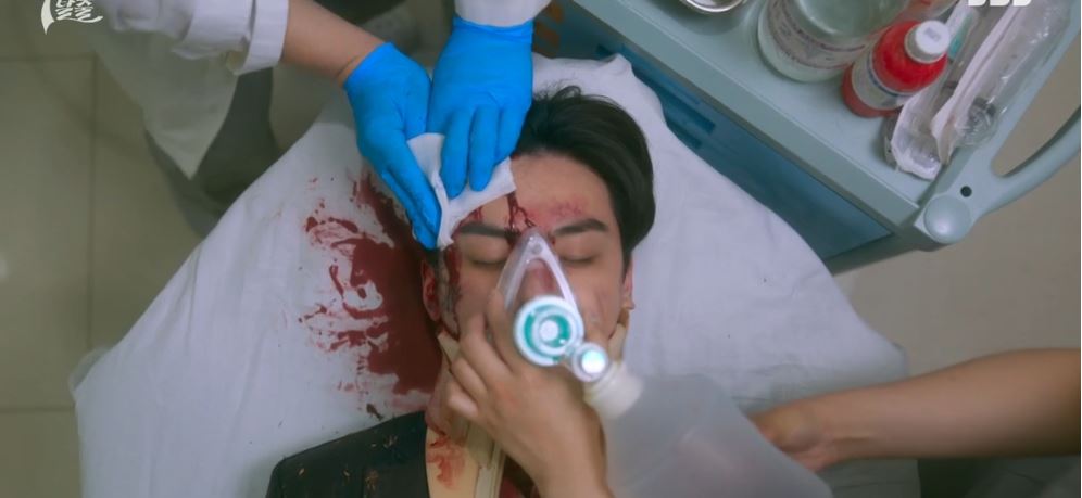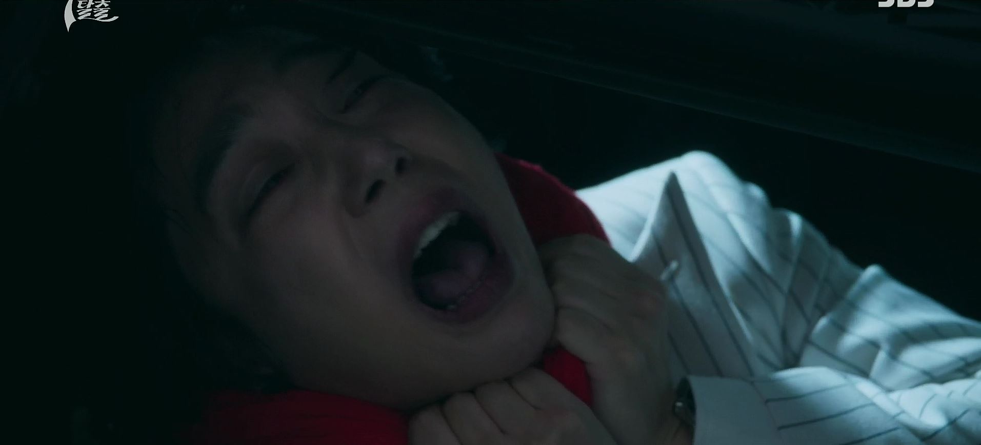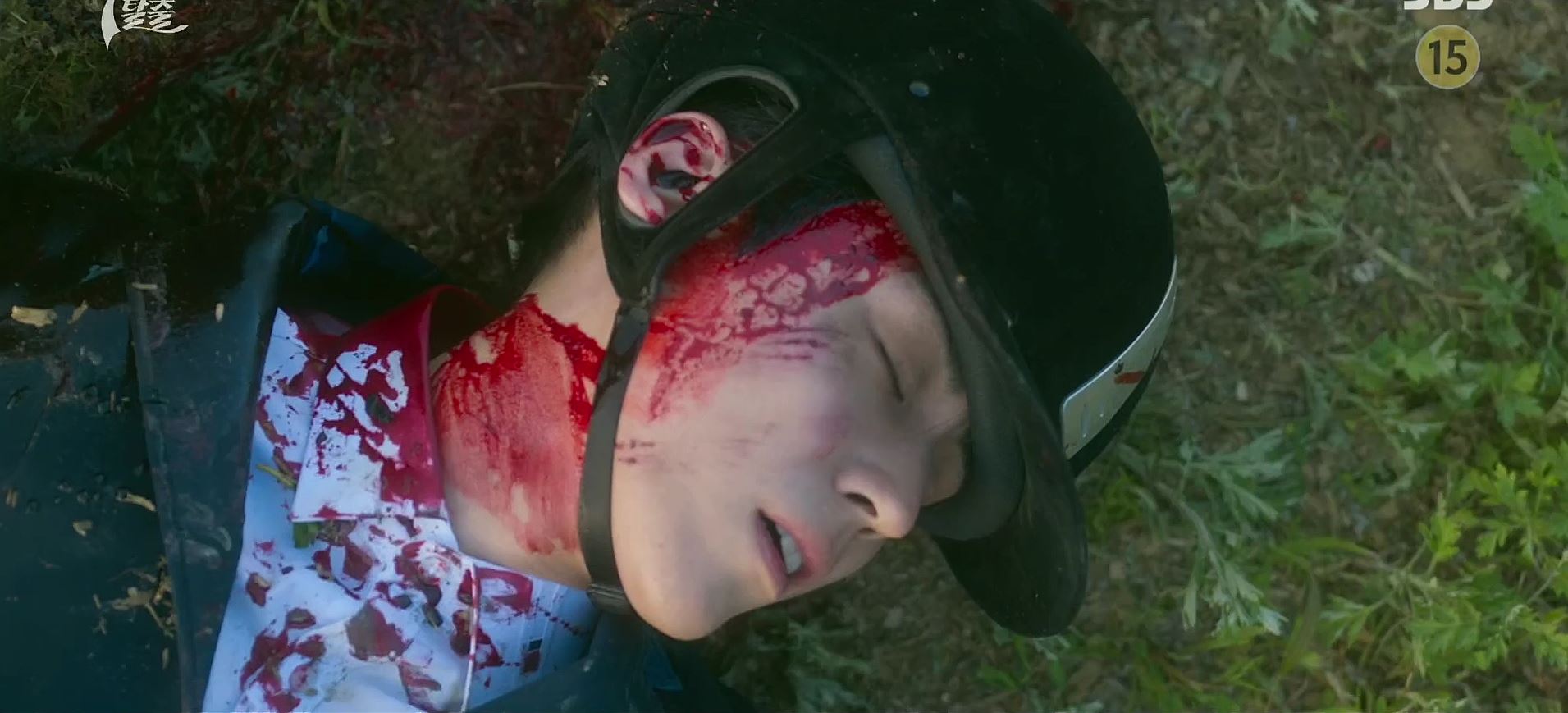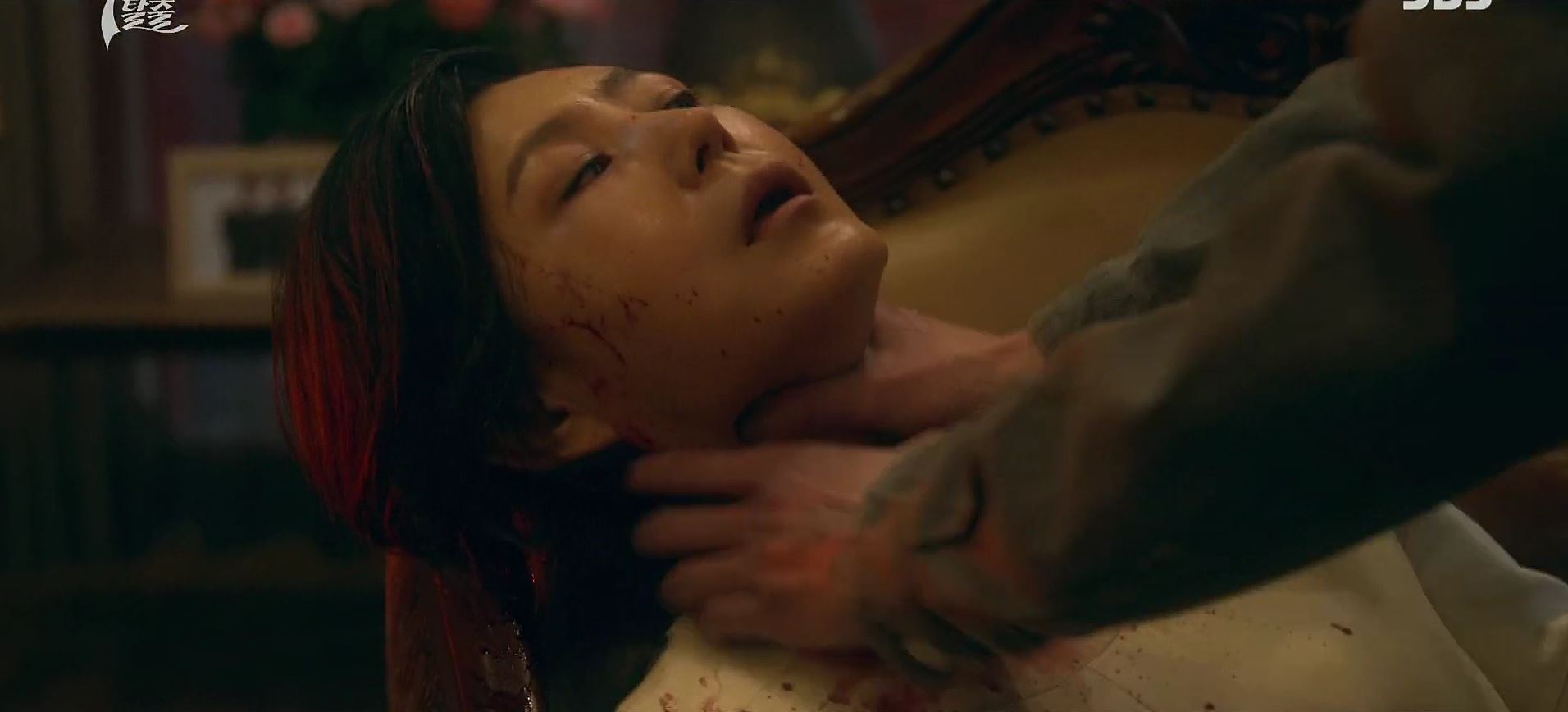 도혁은 K에게 칼을 맞고 쓰러져 있고, 누군가가 손에 피를 닦아내고 있습니다.