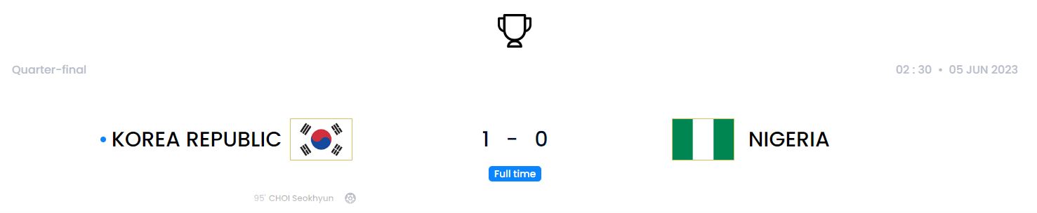 하지만 남은 시간 동안 나이지리아는 한 골 차로 거세게 반격을 이어갔습니다. 우메 임마누엘이 연장 후반 5분에 페널티박스 정면에서 오른발 슈팅을 시도했지만 크로스바를 스치며 벗어났고, 추가시간에도 한 번의 슈팅을 시도했지만 골이 나오지 않았습니다. 결국 한국은 한 골 차로 리드를 지켜내며 4강행을 확정했습니다.